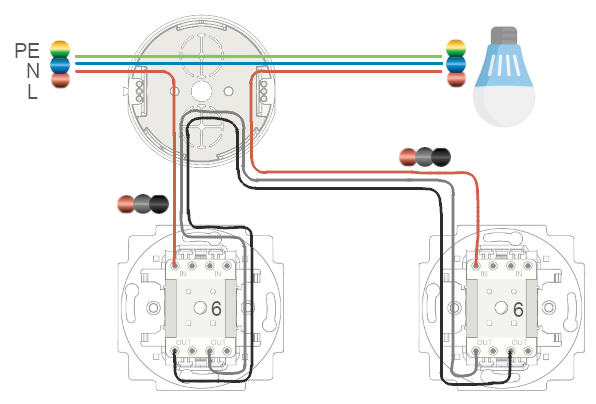 Obecné informace a schémata vypínačů všech řazení jsme vám přinesli v průvodci zapojení vypínačů. Nyní se pojďme podívat, jak zapojit schodišťový vypínač.
