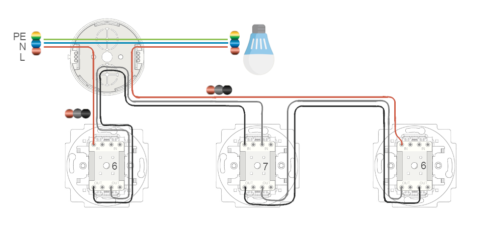 První a třetí vypínač je č.6, prostřední vypínač je č.7. Křížové vypínače jsou již vybaveny propojením vývodů "křížem". Na takovém křížovém vypínači se tedy stačí podívat, které dva kontakty jsou vstupy (IN) a které dva jsou výstupy (OUT). Zapojení je jinak intuitivní. I zde platí, že kabel mezi vypínači musí mít alespoň dva vodiče. Názorně je vše vidět na schématech níže.