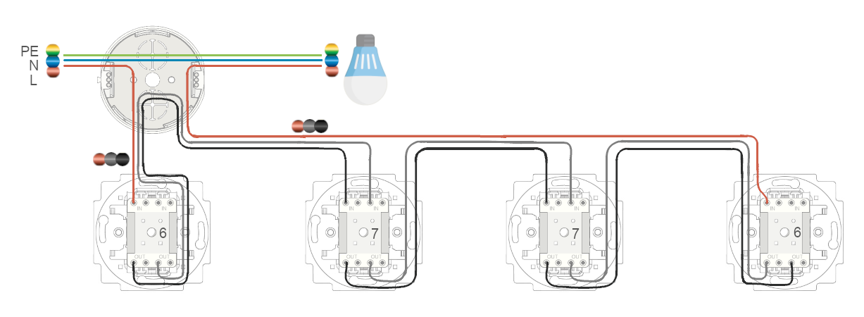 Ovládání světla ze 4 míst je analogické ovládání světla ze 3 míst. Stačí zařadit další křížový vypínač č.7 vedle předchozího vypínače č.7. Při správném řazení čtyř vypínačů č.6, 7, 7, 6 docílíme zapínání a vypínání osvětlení (obecně spotřebiče) ze čtyř míst současně. Jak zapojit čtyři vypínače řazení č.6 a č.7 pro vícepatrové schodiště? To ukazují schémata níže.
